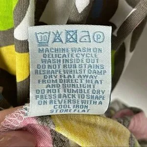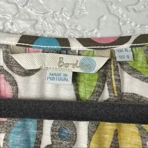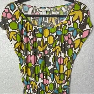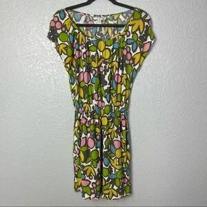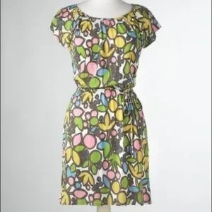Boden blouson casual dress in Tencel/cotton jersey fabric. Cute multi-colored print. Elasticized waist. Dress has thread belt loops but belt is not included. Size US 4.