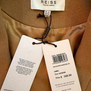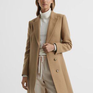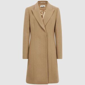 The Harlow coat is a key REISS shape, crafted from an Italian wool blend – securing its place in the core wardrobe for this season and beyond. It's a smart double-breasted design with peak lapels and a concealed button closure, for a uniform finish. The mid-length design and classic camel shade make it a wearable piece that’s easily transitioned between casual and formal ensembles alike.