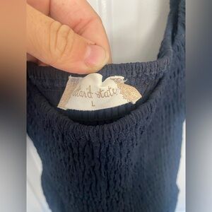 This women's dress from Altar'd State features a checked navy blue pattern and a square neckline with puff sleeves. The dress is made of polyester material and has a long maxi length, perfect for both casual and party/cocktail occasions. The size is a regular fit large and the dress has a vintage-inspired style, but not actually vintage. The dress is ideal for women who enjoy sundresses and maxi dresses, and it comes in a beautiful blue color that will make you stand out.