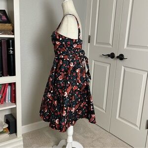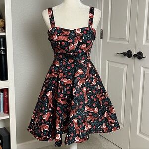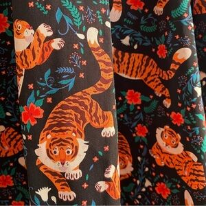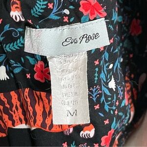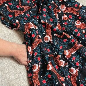 Adorable Eva Rose sleeveless fit and flare dress pockets. Fold-Over top. Pinup style. Black with red flowers, green leaves and cute playful tigers. Attached tie belt. Size M. Pit to pit approx 16”. Waist 12.5” across. Length 30”. Excellent condition.