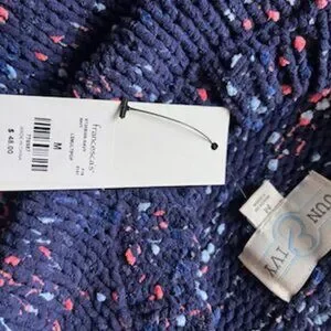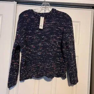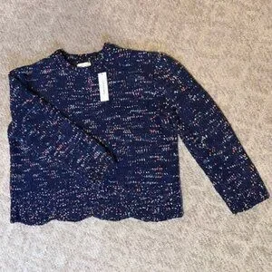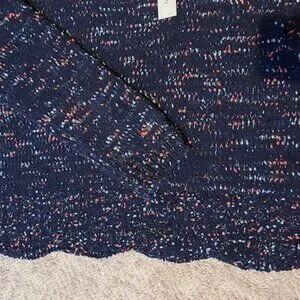 Navy blue with pink and light blue specs comfy sweater. Brand new with tags, never worn. Beautiful scalloped edge at waist.