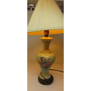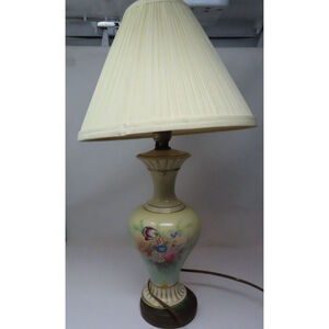 Vintage table lamp (NO SHADE), estimated 1950s, features a hand-painted floral design on a porcelain urn base with gold accents. The lamp stands 16 inches tall to the top of the bulb holder, 13" to top of porcelain. It has a diameter of 5 5/8" inches at the largest part.