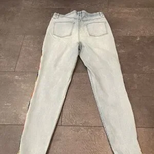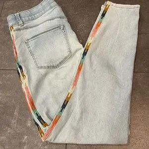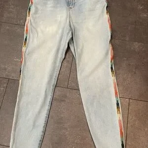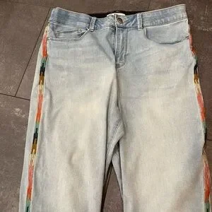 Knox Rose Size 12 light washed blue jeans. Preowned in great condition. Aztec style side seam embroidery in multi color. Zipper button closure. Stretchy fabric and waistband for extra comfort. 62% cotton 23% polyester 12% rayon 3% spandex.