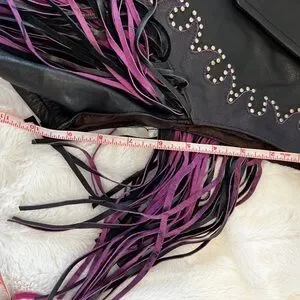 Excellent like new condition. Motorcycle vest, black and purple leather, with multi purple and black fringe and silver colored studs in a curly cue design to show off the wearer’s waist with purple stitching. This item was gently worn and carefully stored after the riding season every year. Lined fully with an elastic area across the back of the waist for comfort in riding position or a seating position, as the passenger. Love the fringe in the wind!
