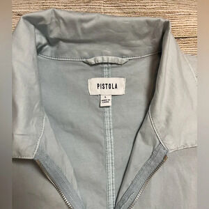 Super cute Pistola Meg Romper in Sky Blue.zip up with drawstring at waist. Hip pockets. Inseam approx 3”. Size L. Pit to pit approx 22.5”, waist approx 20” across, total length approx 43.5”. Excellent preowned condition with no signs of wear.
