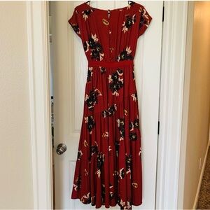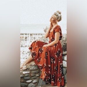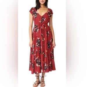 Beautiful Free People floral midi dress in a rich rust/red tone with an effortless boho silhouette. Features a flattering V-neckline, short sleeves, and a self-tie waist that cinches perfectly. Tiered skirt adds movement and flow—easy to dress up or down.