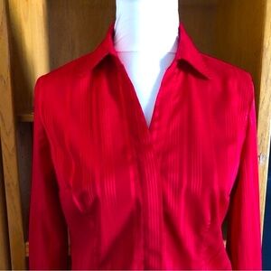 This EUC red blouse by Croft & Barrow has a collared v-neckline, stretch slim fit, and an invisible five button front. It has long sleeves with a three button cuff. The fabric is 96% polyester, 3% spandex, and 1% other. Measurements- pit to pit-18”, length-23”, sleeve-22.5.