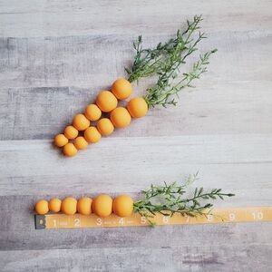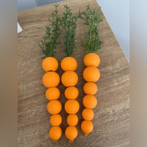 Charming set of three decorative carrots. Perfect for adding a touch of whimsy to your decor. Bright orange with green tops.