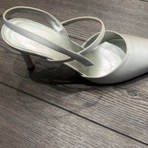 New without box Anne Klein New York white slingback heels. Shiny white satin-like fabric. Please see photos for two small glue marks. Approximately a 3 inch high heel. Perfect for a wedding, evening out, or dance.