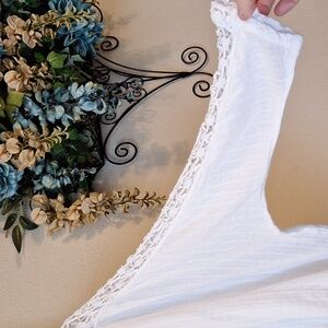 Free People White lined V-neck Cropped Blouse. Beautiful Crochet Sleeve design down arms.