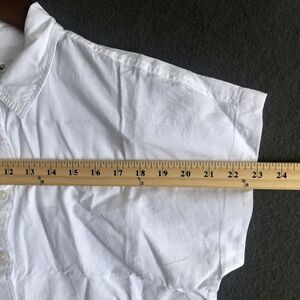 This Madewell top is a white crop shirt in size Small, featuring a relaxed fit with dolman short sleeves and a collared neckline. The shirt is made of a blend of Lyocell, linen, and cotton, making it lightweight and breathable. It has a button-up closure and falls under a bohemian and classic theme. The top is brand new with tags, perfect for a casual and stylish look.