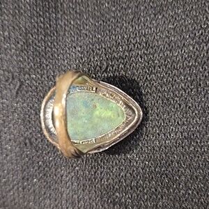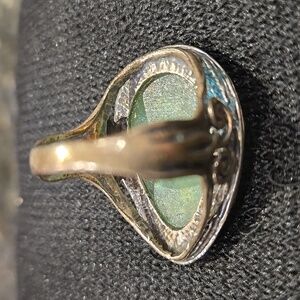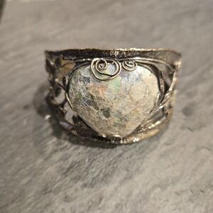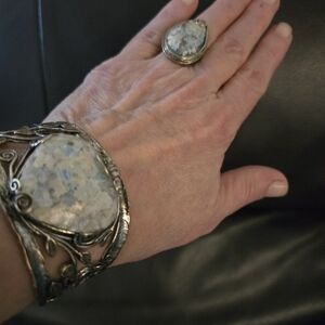 Elegant silver bracelet and ring set. Features a unique Roman Glass stone design. Perfect for adding a touch of sophistication.