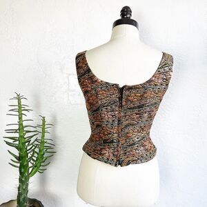 Sleeveless cut, scoop neckline, notched hem, smooth running back metal zipper and rich colors of gold, baby blue, mint green, jet black, mauve and silver intertwine in a raised & textured abstract metallic that gives this a psychedelic touch. Fully lined in black acetate.