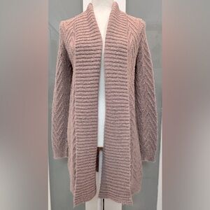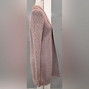 This cozy long-sleeved open cardigan in a soft heathered dusty lavender is a must-have for your wardrobe! With a relaxed fit, it measures 15" pit-to-pit (from the back) and has a 34" length. Size Small, perfect for layering over your favorite tops or dresses. Was fuzzy when purchased, has gotten fuzzier since then. 😀