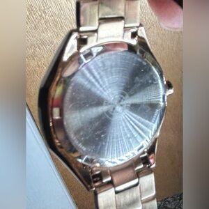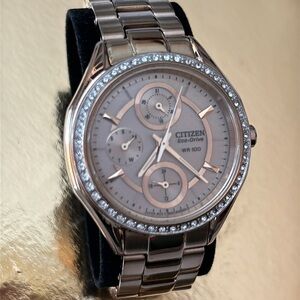 Beautiful Citizen Eco-Drive (Solar) Japan movement calendar watch with day of week, day of month and 24 hour dials. Stainless steel casing in gold and champagne tones. Water resistant up to 100 meters. This elegant watch is working and there’s no need to wind; just make sure it gets any type of light to keep it charged. This watch has a fold over push button clasp and links can be removed from bracelet to adjust to your wrist size.