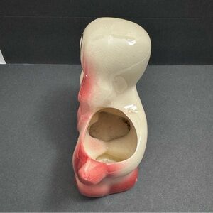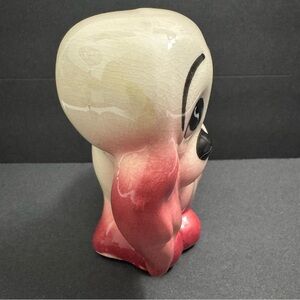 This vintage ceramic planter features a small Puppy Dog design in the form of a Cocker Puppy with big, sad eyes. The planter is ivory and pink in color, with a glazed finish and measures 5 inches in length. It reflects a 1950s style and theme, making it a charming decorative piece for any room. The planter is made of ceramic and was manufactured in the United States during the 1950-1959 time period. Perfect for teens, adults, and kids who appreciate classic design and puppy motifs.