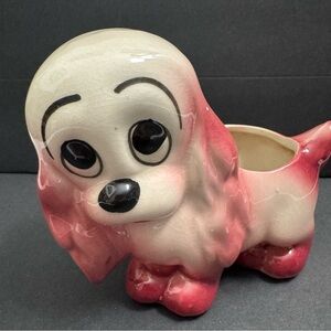 Vintage Cocker Puppy Big & Sad Eye Dog Ceramic Planter, Ivory And Pink, 5” Tall