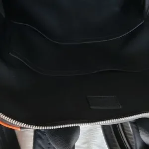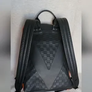 From the 2017 Collection. Men's orange Damier Infini coated canvas Louis Vuitton Infini Avenue Backpack with brushed silver-tone hardware, black leather trim, dual flat shoulder straps, single flat top handle, dual exterior zip pockets at front, black woven lining, three interior slit pockets and two-way zip closures at top.