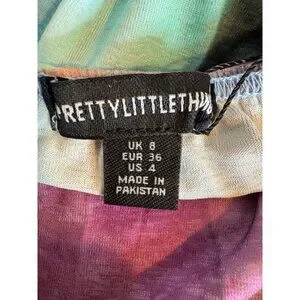 maxi dress, abstract print, colorful dress, PrettyLittleThing, cowl neck, spaghetti straps, summer dress, polyester, multicolor, UK 8, elegant dress, fashionable, women's clothing, maternity, long dress, BBQ, entertain, sexy