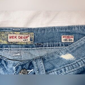 -Distressed with MEK’s unique angled front pockets and distressed M logo on back pockets with flap.