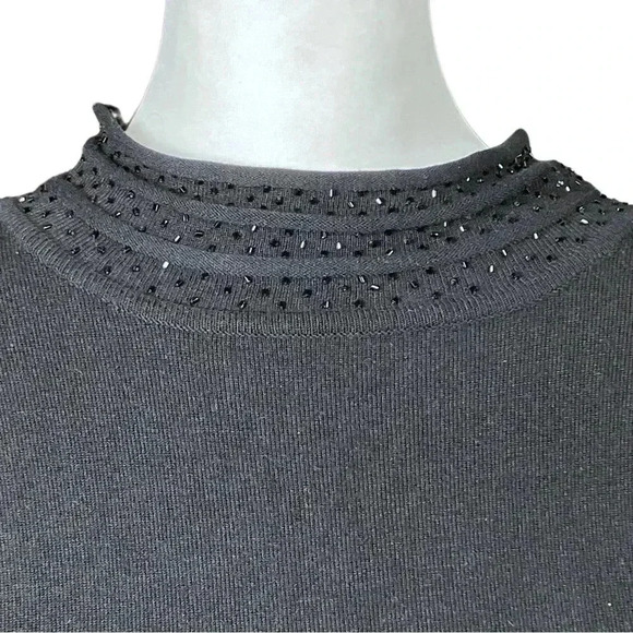 Super soft black knit tank with rows of subtle black seed beads at the neckline from Xscape by Lawrence Kurtz from the 1990s or early 2000s.