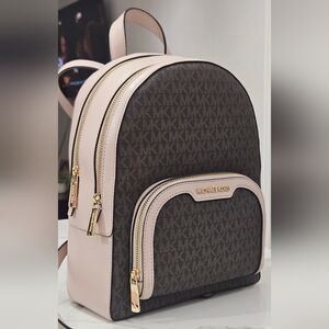 Stylish Michael Kors backpack with signature logo pattern. Features pink accents and gold-tone zippers. Perfect for everyday use.
