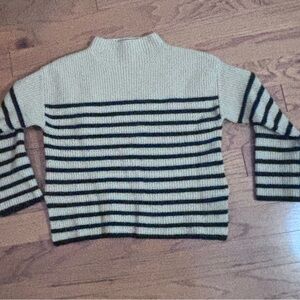 Claudia Camel & Ebony Striped Sweater. Mock neck. Drop shoulder. Chunky ribbed knit. Long sleeves. Side slit hem. Wool/viscose/nylon/cashmere blend. Dry clean.