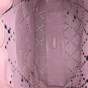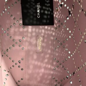 This stunning Chanel tote is crafted from black perforated patent leather with beige accents and gold hardware. While the bag has been used and shows signs of wear, it remains a timeless and beautiful piece. The exterior was repainted, with some minor bleeding visible on the interior (see photos). Additional details: