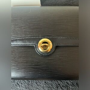 Elegant black clutch with textured Epi leather. Features a gold-tone circular clasp. Perfect for evening outings.