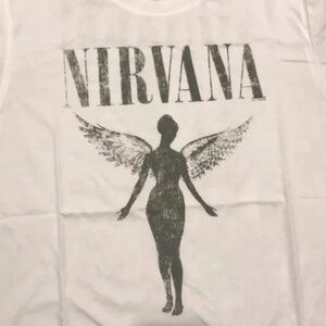 Vintage styled band tee ‘Nirvana’ with winged angel. Soft comfortable material with a little stretch.