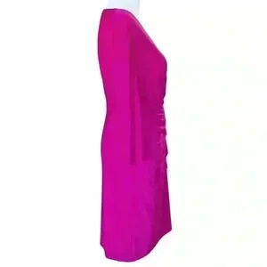 Magenta cocktail dress with three-quarter length sleeves v neck, draping to flatter your figure, ruffle detail, faux wrap dress look via draping. Black Label by Evan-Picone.
