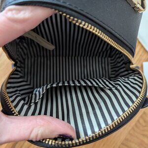 Adorable Binx backpack by Kate Spade featuring black crosshatched leather and matching trim, black and white bookstripe lining and cat ears, gem nose and gold whiskars. Zippered closure backpack can convert to a shoulder bag or handheld clutch.