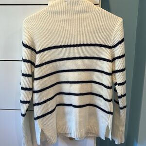 Lulus Confident Poise White Striped Mock Neck Pullover Sweater! Medium gauge ribbed sweater knit shapes this chic sweater that has a striped pattern throughout. Long sleeves boast wide cuffs, framing a relaxed-fit bodice with a mock neckline. Notched hems complete the look.