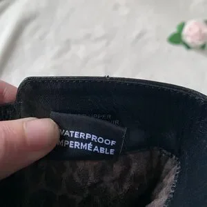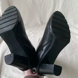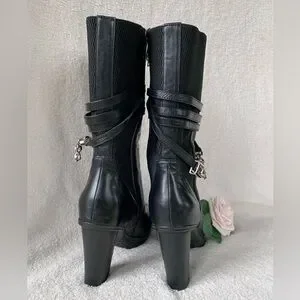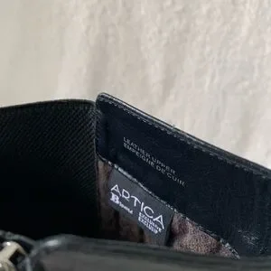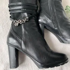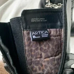 These Exclusive Artica black leather heeled boots are in excellent, lightly pre-loved condition. Size 8 and true to size. Features strappy leather wrap with chain buckle detailing to add character to these gorgeous boots. Amazing cushioned support, very comfortable to wear. 100% waterproof as well! Has stretchy side panelling for a cozy fit. Heel height is 3.5”. Exclusive to Brown’s Shoes, these Articas are rare and hard to come by. If you’ve ever owned a pair of Artica boots you’ll know they don’t sacrifice on comfort or quality, these boots will last a lifetime!