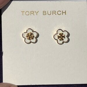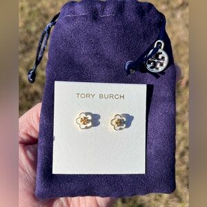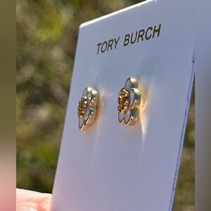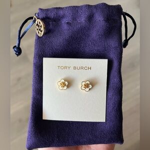 NWOR Tory Burch Kira Flower Stud Earrings. Mother of pearl flower, signature T, 18k gold plated brass, nickel free, push back, .4 in x.4 in. Comes with Dust Bag.