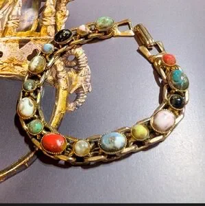 Gorgeous Vintage Gold tone Heavy Chain Bracelet featuring bezel set Art Glass Cabochons that look like gemstones. It measures 7.25" long and 5/16" wide. In Great Vintage Condition. You'll love this Treasure for your Quality Vintage Jewelry Wardrobe.