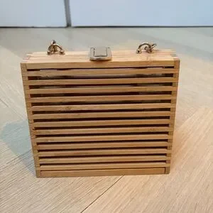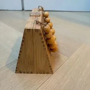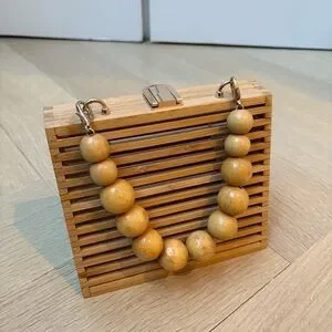 Unique, super cute wooden handbag. Removable beaded handle with gold lobster clasps. Wear it as a clutch or add a long strap! Perfect for vacation, poolside, and wineries.