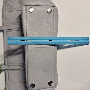 This elegant gray tote bag is perfect for any occasion. Its sleek design and spacious interior make it a must-have accessory. Add a touch of sophistication to your outfit with this versatile bag. Beautiful soft leather. Interior has some spots (see pohotos) but is otherwise in great shape, no smells, etc.