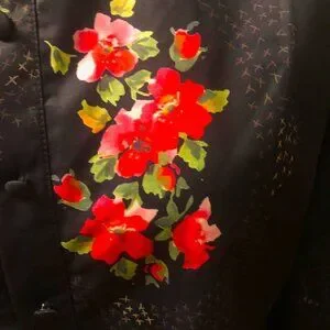 DONNA BELLA Bohemian charm black satin fabric sprinkled with multicolor floral motifs, long sleeve blouse and long skirt, two-piece beautiful ensemble.The blouse featured a small ruffled neckline, covered button front closure and long sleeves with elasticated cuffs. The skirt has a 12 Inch ruffle, elasticated waist and black lining. Great quality satin Polyester. Dry Clean. Pit to Pit 19 Inch Skirt Length 34 Inch. Excellent condition never worn, NEW without tag. Size M