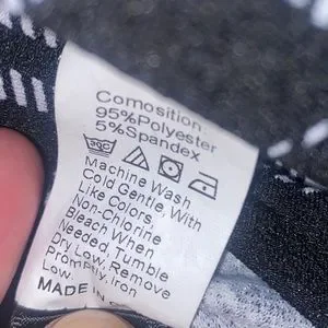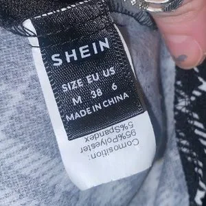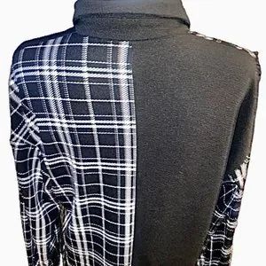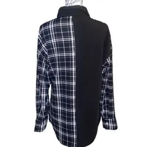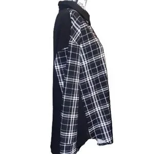 From SHEIN this women’s size medium long sleeved button down top is in excellent like new condition only worn once. It is oversized in fit with a polo collar and front top to bottom button up closure. The sleeve cuffs have a button closure on each side. Black & white in color, it has a color block pattern from solid black to plaid pattern. Bottom hem is scooped. Wear alone or open with a tank top. Made from 95% polyester & 5% Spandex