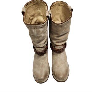 Step out in style with the Frye Women's Carmen Braided Harness Boots. These beige boots feature a chic braided harness design, perfect for a western-inspired look. Crafted for comfort and durability, they are ideal for any occasion.