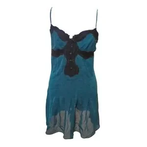 Vintage Victoria Secret teal printed lace trim button detail chemise s small