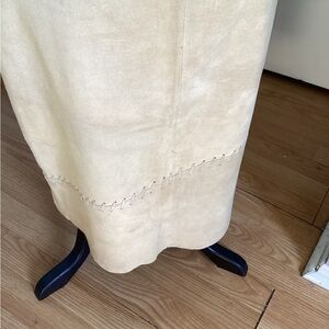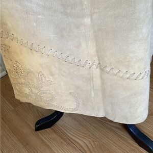 Step out in style with this elegant beige leather suede skirt. Perfect for any occasion, it offers a chic and sophisticated look. Skirt is fully lined and has beautiful leather embroidered designs woven throughout. Great condition.