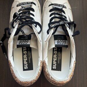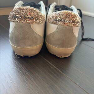Authentic Golden Goose Super-Star Classic. Leather upper laminated star, glitter heel, suede spur metal lettering.