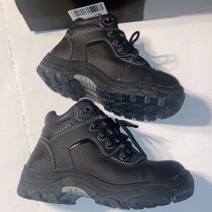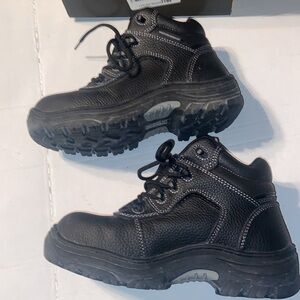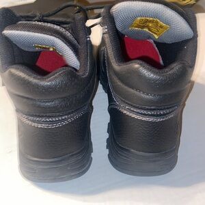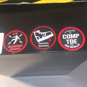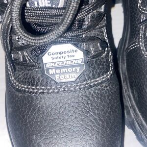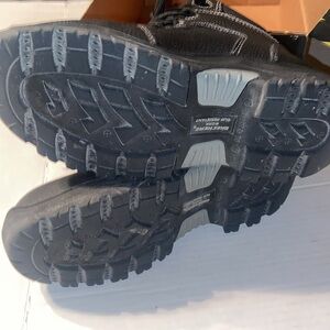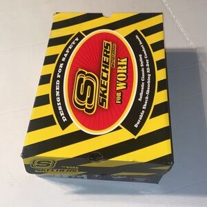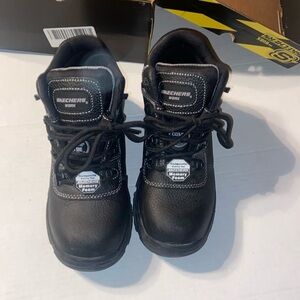 These New in box Skechers for work black high top shoes are a size 7.5. They are puncture and electric hazard resistant with a non metallic comp toe box. These shoes are in excellent condition.