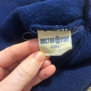 Dr Who Tardis Laplander Hat. This hat is dark blue, with a white Police Box design and a white pom-pom from the BBC show Doctor Who. The hat is in great condition, but it is used and has been worn. There are some minor pilling on the hat and loose thread in the braids. Additionally, the tag is worn and some of the letters are no longer visible. But none of this is noticeable once the hat its on.