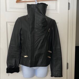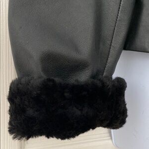 Elevate your style with this chic black leather jacket featuring a luxurious real lamb fur collar. Perfect for adding a touch of elegance to any outfit. Can be worn a number of ways. NWT.