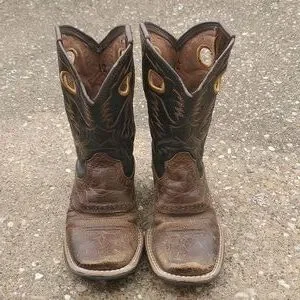 Ariat Roughstock distressed brown leather cowboy boots. Toddler youth size 12. These have been worn and loved and could use some TLC, but they still have good life left in them!