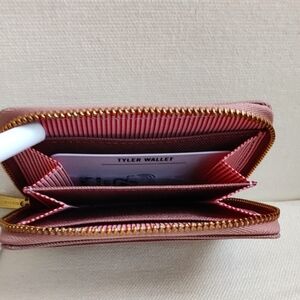 Compact and stylish small RFID wallet. Features a zip closure, one exterior pocket, and two interior pockets. Ash rose pink color. Perfect for everyday use.