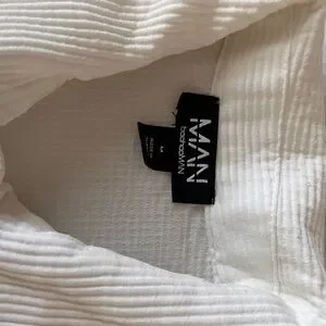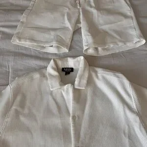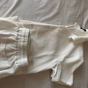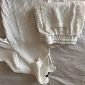 Comfortable white set. Features subtle stripes. Includes top and pants. Perfect for lounging or outing.